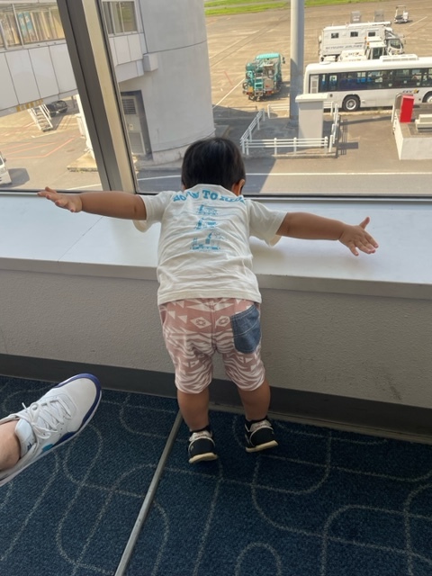 わたくしの息子(2歳)、2回目の飛行機です!羽田空港にて飛行機ポーズ(笑)