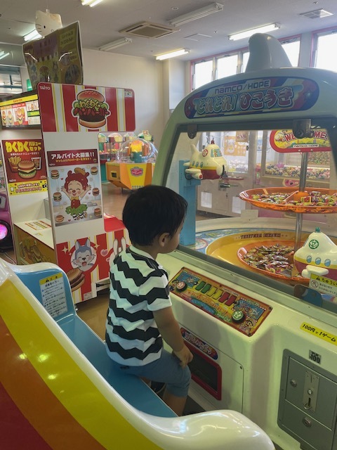 買い物を済ませた後、帰りのフライトまで少し時間があったので(八食センターから三沢空港までは車で30分程度かかります)2階にある子ども用の室内遊技場にも立ち寄りました。有料のあそび場もあるのですが、3歳~を対象とした遊具が多いので、今回はわんぱく広場という無料のあそびスペースにしました。無料とはいえ、すべり台やアスレチック遊具など、2歳の子どもが遊ぶには十分なスペースです。床はふかふかで転んでも痛くなく、ケガもしづらくなっています。こちらで思い切り身体を動かした後、隣にある屋内遊園地・ゲームセンターに行きました。こちらはかなりレトロな空間なので、設置されているゲーム類もレトロ…そして意外にUFOキャッチャーが取りづらい…イカのおもちゃ、取りたかったです…(笑)