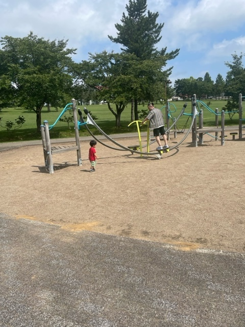 青森県にはどこの市町村にも大きな公園があり、いつも子どもたちの楽しそうな声が響いています。今回の帰省は息子も一緒なので、早速こちらの公園に遊びに行ってきました。ここの公園の良いところの一つが、子ども広場の遊具がたくさんあるところ!!複合遊具が全部で5つもあるので、子どもたちも飽きることなく長時間過ごせると思います。内容は、トンネル滑り台やお城のような遊具をはじめ、スイング遊具やターザンロープなんかもあります。そして、大人がストレッチで使えそうなものも…!これらの遊具が無料で遊び放題です!!ちなみに今回のブログのサムネイル写真も、こちらの公園の大型遊具です。身長85㎝ほどの息子と比べてみるとすごく大きいのがわかります。初めて見た広い公園と楽しそうな遊具に、息子の目はキラッキラ(笑)駐車場に停める先から「行く!行く!」と夢中でした。