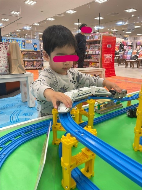 実はここのショッピングモール、リニューアルした際にトミカとプラレールの専用コーナーができたのです。以前のブログにも書きましたが、最近の息子はプラレールが大のお気に入り!自由に遊べるプラレールコーナーはそんな息子にとってパラダイスです(笑)パラダイスを見つけたらもう…素直に帰るわけありませんよね。猛ダッシュで遊びに行き、自分で車両をゲット!(自由に遊べる車両はたくさん置いてあるわけではないので争奪戦です)いくら親が帰ろうよ~と言っても断固として動かない息子でした。
