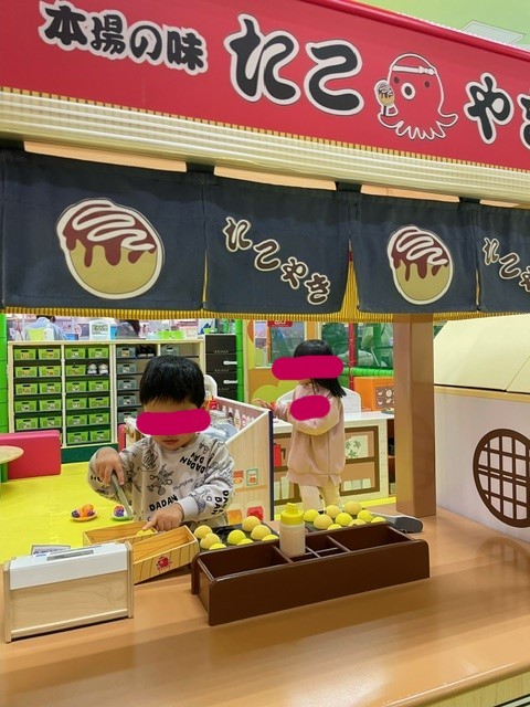 ポンポンだけでなく、ふわふわの滑り台、たこ焼き屋さん、ミニカー広場などなど、いろんなおもちゃで遊びました。ふわふわの滑り台は4月に来た時には怖がって登れもしなかったのに、今回はスイスイと登りシューー!!っとお手の物。子どもの成長はすごいですね。わたくしの方がびっくりしてしまいました。