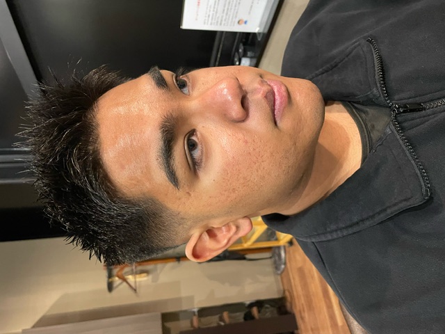 前回の掲載時はブリーチした金髪が残るフェードスタイルでしたが、今回は黒髪ver.です。
