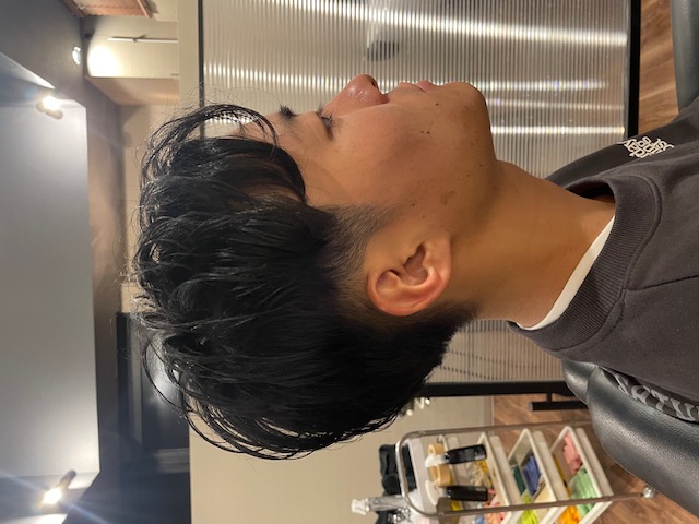 周りを刈り上げ、センターパートにSカールのパーマをミックスしました。柔らかめのワックスを使用することでパーマの動きが出るようになります。