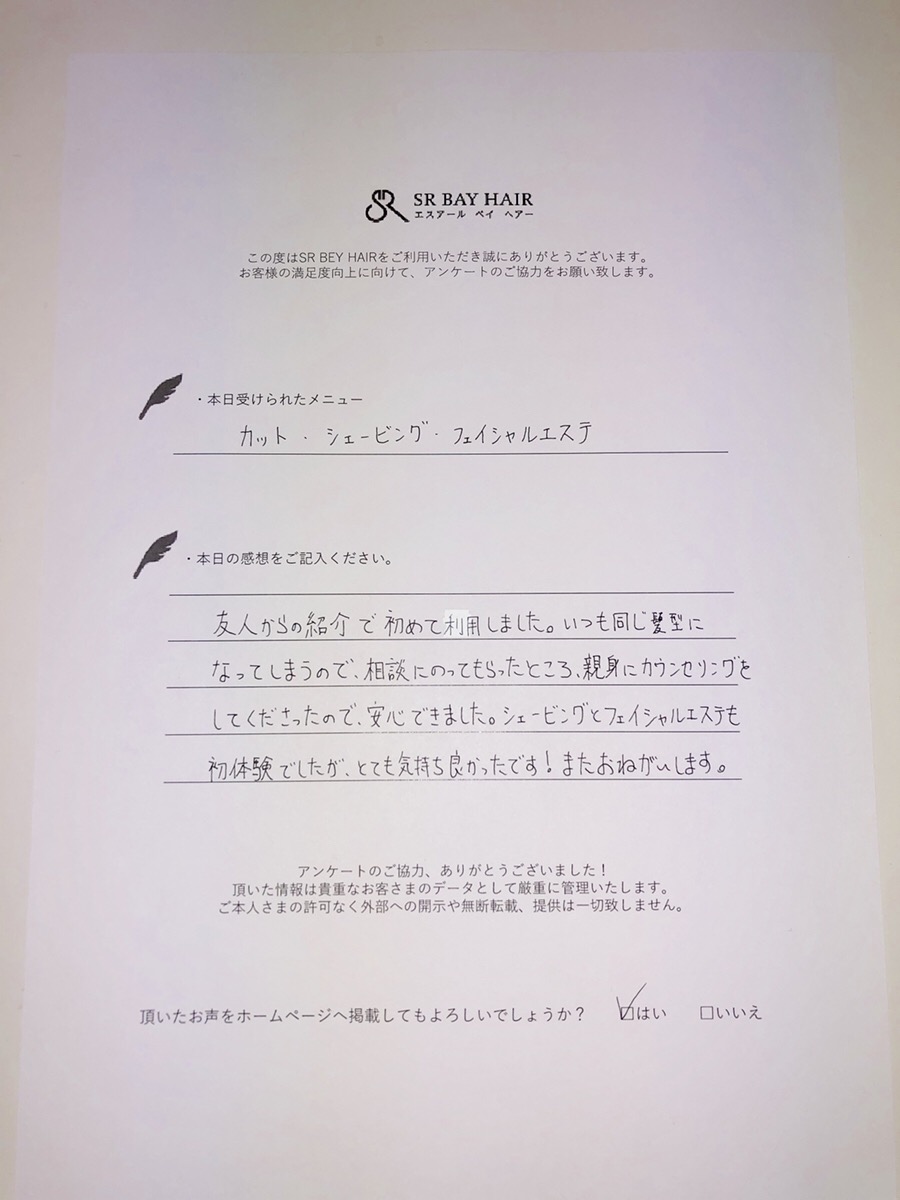 シェービングとフェイシャルエステも初体験でしたが、とても気持ち良かったです!またおねがいします。